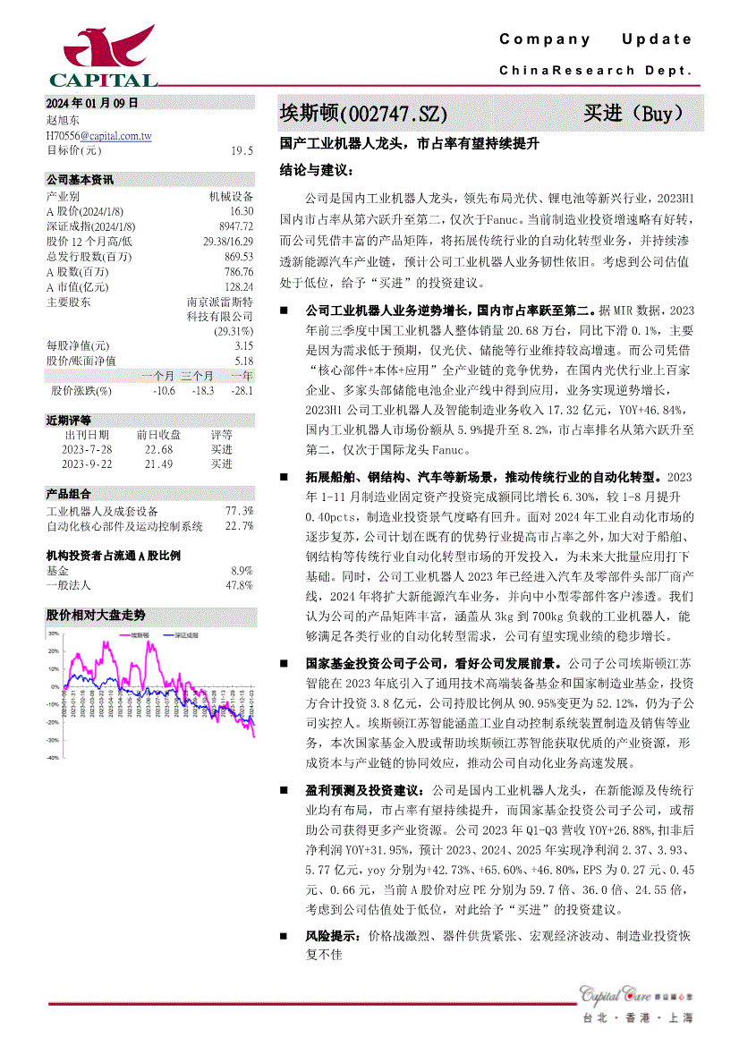 C o m p a n y U p d a t e C h i n a R e s e a r c h D e p t 。 阿2024年01月09日赵旭东方针价(元) 19。5 公司根基资讯财产别机械设备A股价(2024/1/8) 16。30 深证成指(2024/1/8) 8947。72 股价12个月高/低29。38/16。29 总刊行股数(百万) 869。53 A股数(百万) 786。76 A市值(亿元) 128。24 次要股东南京派雷斯特科技无限公司(29。31%) 每股净值(元) 3。15 股价/账面净值5。18 一个月三个月一年股价涨跌(%) -10。6 -18。3 -28。1 近期评等出刊日期2023-7-28 2023-9-22 前日收盘22。68 21。49 评等买进买进产物组合工业机械人及成套设备77。3% 从动化焦点部件及活动节制系统22。7% 机构投资者占畅通A股比例基金8。9% 一般法人47。8% 股价相对大盘走势埃斯顿(002747。SZ)买进(Buy) 国产工业机械人龙头,市占率无望持续提拔结论取:公司是国内工业机械人龙头,领先结构光伏、锂电池等新兴行业,2023H1国内市占率从第六跃升至第二,当前制制业投资增速略有好转,而公司凭仗丰硕的产物矩阵,将拓展保守行业的从动化转型营业,并持续渗入新能源汽车财产链,估计公司工业机械人营业韧性照旧。据MIR数据,2023年前三季度中国工业机械人全体销量20。68万台,同比下滑0。1%,次要是由于需求低于预期,仅光伏、储能等行业维持较高增速。而公司凭仗“焦点部件+本体+使用”全财产链的合作劣势,正在国内光伏行业上百家企业、多家头部储能电池企业产线中获得使用,营业实现逆势增加,2023H1公司工业机械人及智能制制营业收入17。32亿元,YOY+46。84%,国内工业机械人市场份额从5。9%提拔至8。2%,市占率排名从第六跃升至第二,仅次于国际龙头Fanuc。2023年1-11月制制业固定资产投资完成额同比增加6。30%,较1-8月提拔0。40pcts,制制业投资景气宇略有回升。面临2024年工业从动化市场的逐渐苏醒,公司打算正在既有的劣势行业提高市占率之外,加大对于船舶、钢布局等保守行业从动化转型市场的开辟投入,为将来多量量使用打下根本。同时,并向中小型零部件客户渗入。我们认为公司的产物矩阵丰硕,可以或许满脚各类行业的从动化转型需求,公司无望实现业绩的稳步增加。公司子公司埃斯顿江苏智能正在2023岁尾引入了通用手艺高端配备基金和国度制制业基金,投资方合计投资3。8亿元,公司持股比例从90。95%变动为52。12%,仍为子公司实控人。埃斯顿江苏智能涵盖工业从动节制系统安拆制制及发卖等营业,本次国度基金入股或帮帮埃斯顿江苏智能获取优良的财产资本,构成本钱取财产链的协同效应,鞭策公司从动化营业高速成长。盈利预测及投资:公司是国内工业机械人龙头,正在新能源及保守行业均有结构,市占率无望持续提拔,而国度基金投资公司子公司,或帮帮公司获得更多财产资本。群益证券()无限公司。不合错误此演讲之精确性及完整性做任何,或代表或做出任何书面,并且不会对此演讲之精确性及完整性负任何义务或权利。群益证券()无限公司,及其分公司及其联营公司大概正在收到此份演讲前利用或按照此份演讲之材料或研究保举做出任何步履。群益证券()无限公司及其任何之一位董事或其代表或雇员不会对利用此份演讲后招致之任何丧失负任何义务。群益证券()无限公司及其任何之一位董事或其代表或雇员或会对此份演讲内描述之证持看法或立场,或会买入,沽出或供给发卖或出价此份演讲内描述之证券。群益证券()无限公司及其分公司及其联营公司可能以其户口,或代他人之户口买卖此份演讲内描述之证。